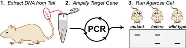 在以小鼠為模式生物進(jìn)行科學(xué)研究的實(shí)驗(yàn)室中,日常和基本的一個(gè)實(shí)驗(yàn)就是提取它們的遺傳物質(zhì)DNA(脫氧核糖核酸)進(jìn)行基因型鑒定,檢測(cè)這些小動(dòng)物的基因組中是否含有特定的DNA。為了能夠從小鼠身上提取足夠的DNA,要從它們身上取下足量的細(xì)胞用于實(shí)驗(yàn)。為了盡可能減少對(duì)動(dòng)物的傷害和方便試驗(yàn)人員的操作,我們只剪下一小段鼠尾作為實(shí)驗(yàn)樣品.
