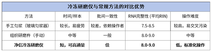 實驗背景:RNA 提取成功與否,很大程度上取決于前處理階段能否借助冷凍研磨儀快速、充分地破碎組織,同時有效抑制 RNA 酶(RNase)活性,從源頭避免 RNA 降解。